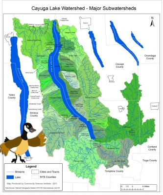 A watershed is an area of land where all of the water drains to the same place. In the Cayuga Lake watershed, that place is Cayuga Lake.