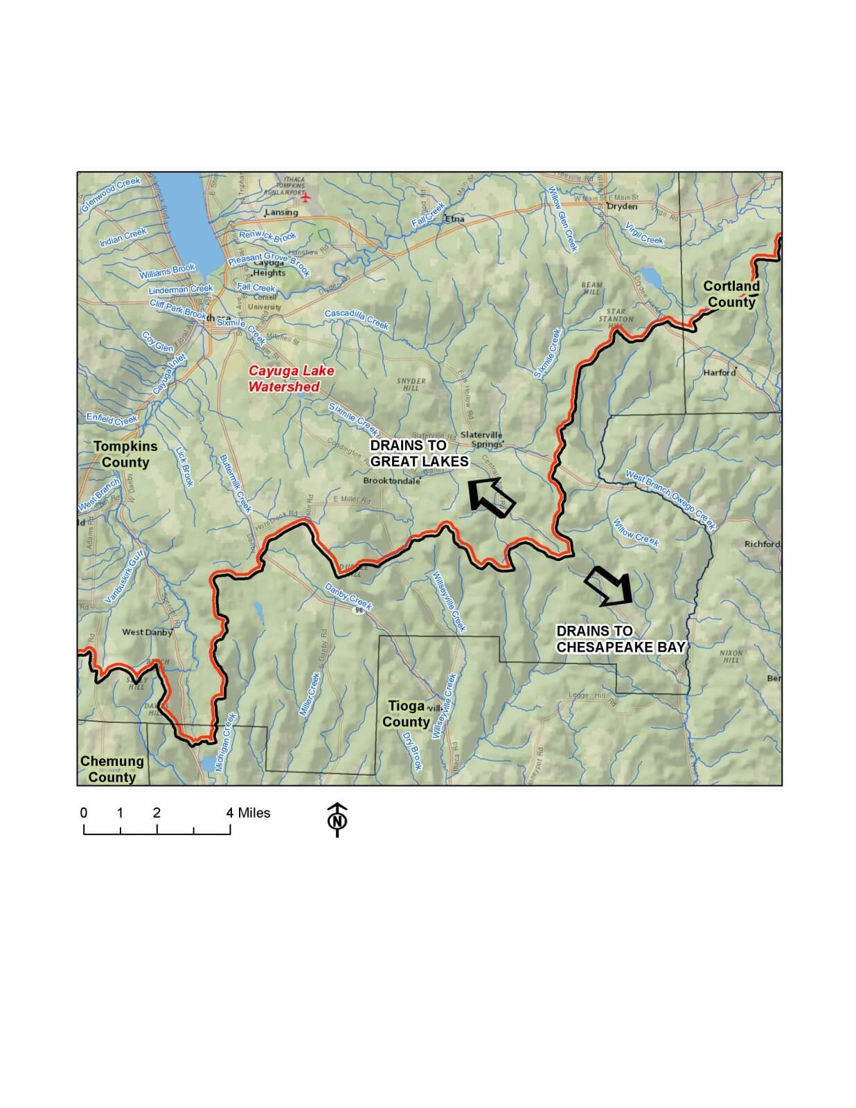 People who live and work in the hills south and east of Ithaca, Dryden, Caroline, Danby and Virgil often traverse a major drainage divide of the North American continent. The locally important Cayuga Lake watershed boundary is part of the longer, continentally-significant St Lawrence Divide (see map, The St Lawrence Divide in New York State).